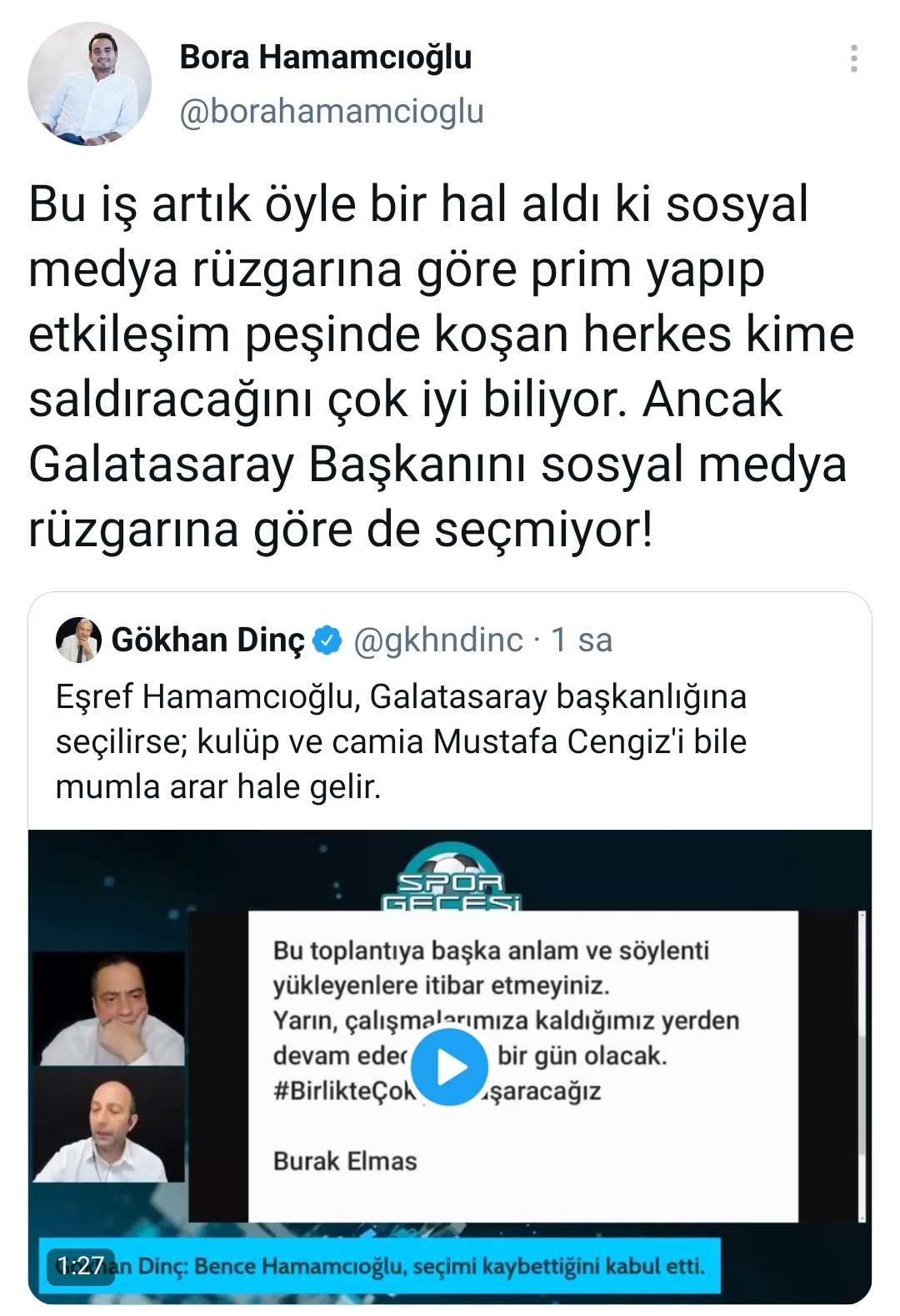 eşref hamamcıoğlu'nun oğlu. tıpkı babası gibi bu arkadaş da sosyal medyada aleyhinde hiçbir şey yazmayan galatasaraylıları bile engelliyor. oysa eşref hamamcıoğlu, röportajlarında 'birlik ve beraberlik' cümleleri kuruyordu ama yaptığı icraatlar tam tersi.