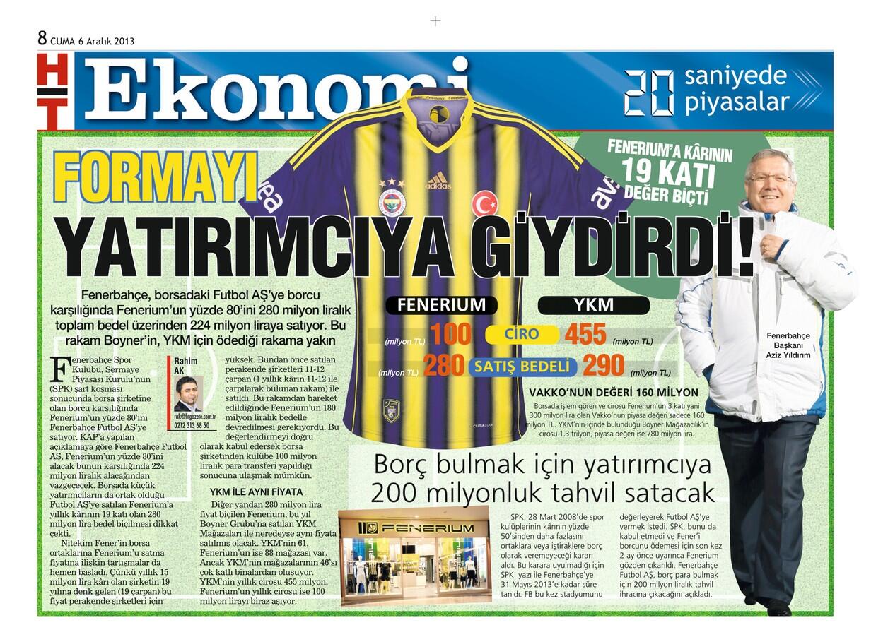 kap’a yapılan açıklamaya göre fenerbahçe futbol aş, fenerium’un yüzde 80’ini alacak bunun karşılığında 224 milyon liralık alacağından vazgeçecek. borsada küçük yatırımcıların da ortak olduğu futbol aş’ye satılan fenerium’a yıllık kârının 19 katı olan 280 milyon lira bedel biçilmesi dikkat çekti.