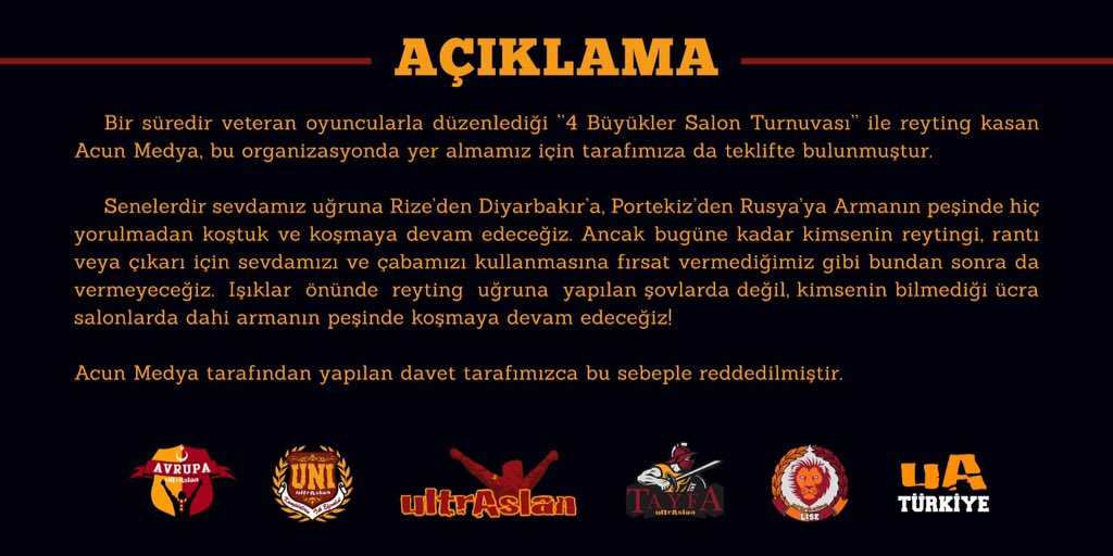 acun medya'nın düzenlediği malum turnuvaya karşı olması gereken açıklamayı yapmıştır. keşke eleştirmek için elinde bayrak en önde koşan taraftarlar, takdir etme zamanı geldiğinde sessizliğe bürünmese..