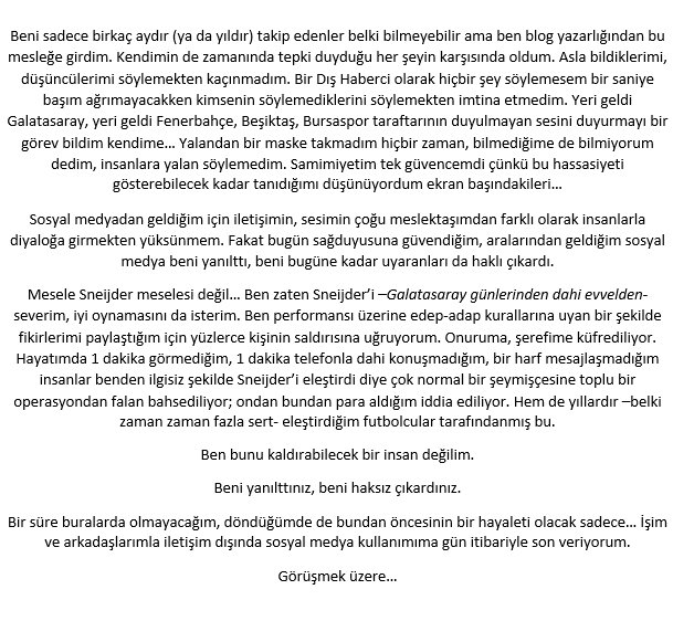 bu arada "eleştirileye tahammülü yok" diye kendi kendine sinirlenenler ve bunu sayfalar boyu tekrarlayan arkadaşlar, sizin zeka probleminiz mi var? adam eleştirildiğim için sosyal medyayı bırakıyorum filan mı demiş? adama cayır cayır küfretmiş bazı şerefsizler. bak üçüncü paragrafta yazıyor: