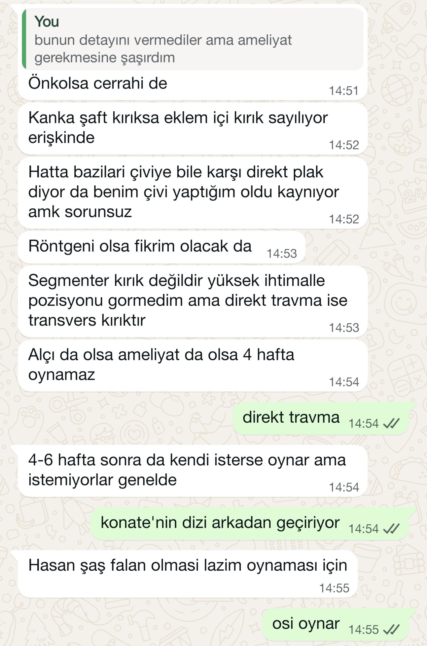 her neyse, bugün fenerbahçeli bir ortopedist arkadaşımla durumu konuşurken fikrini sordum. kendisi spor yaralanmaları konusunda spesifik bir ilgiye ya da uğraşa sahip olmasa da ön kol kırığında cerrahi gerektirebilecek durumları yorumlayabilir kabaca, nitekim bir yerde "kemik" uzmanı bu adam.