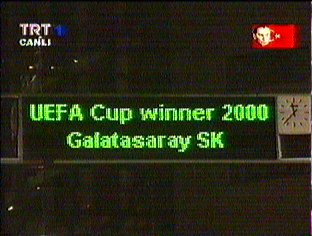 uefa kupasi kazanildiktan sonra parken stadinin tribunlerindeki ekranlardaki ibare: uefa cup winner 2000 galatasaray sk
